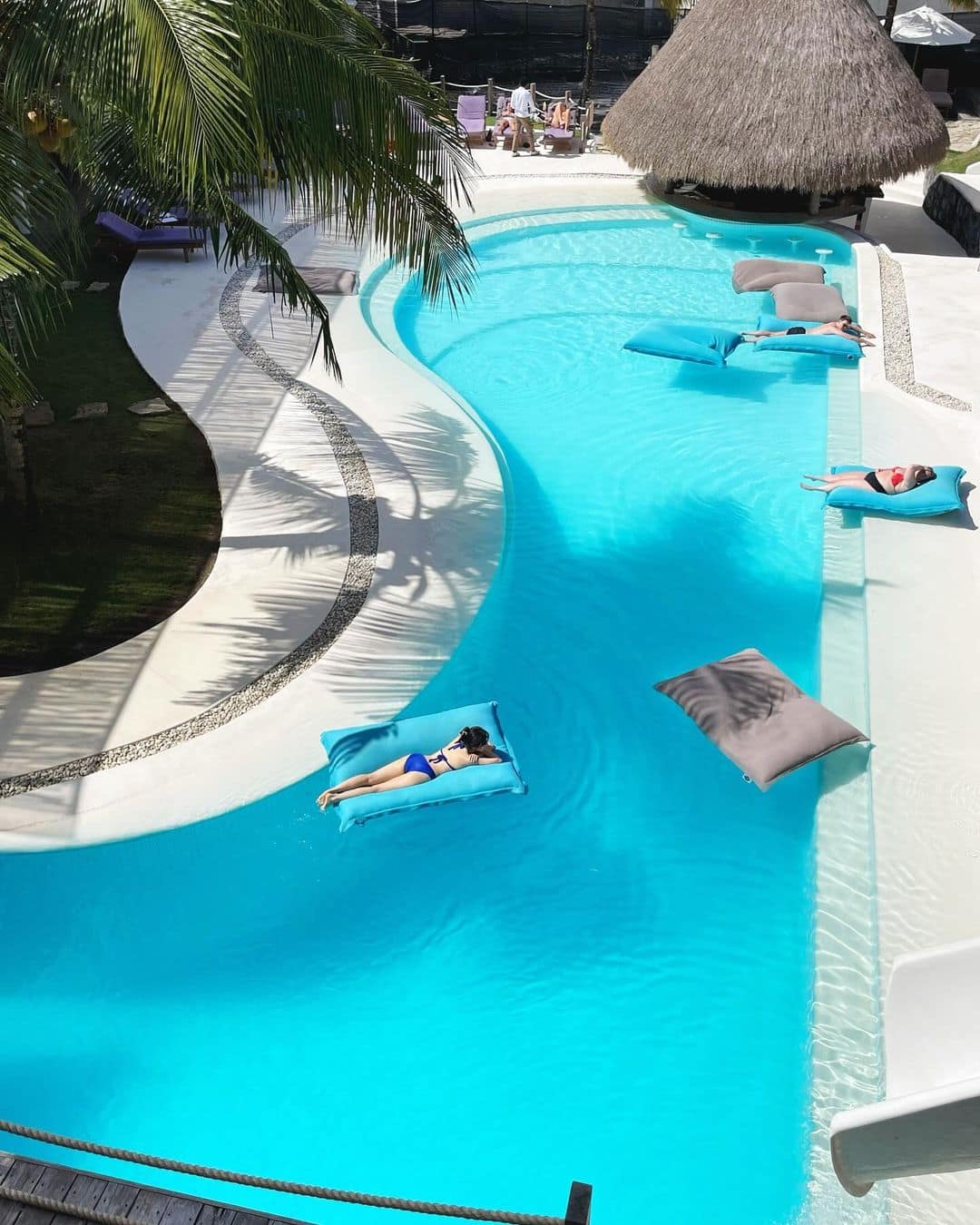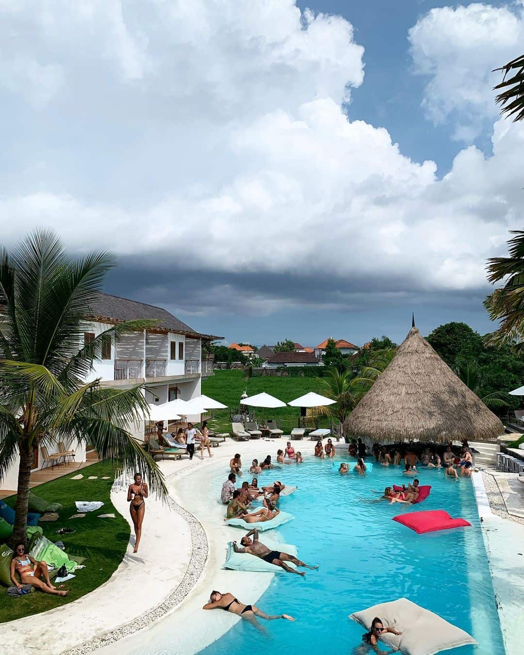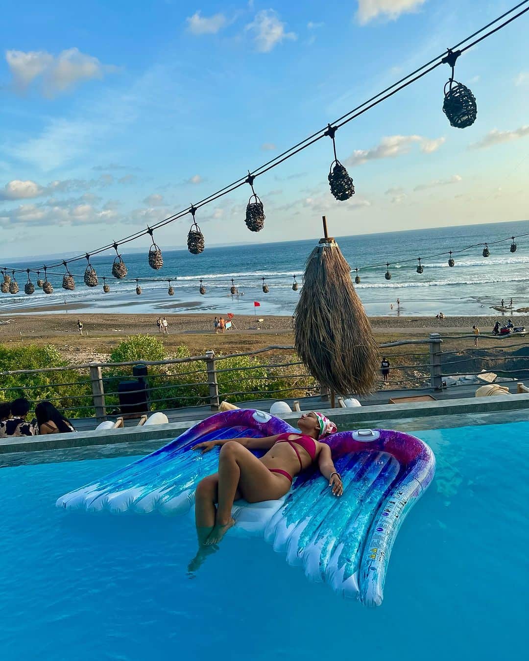 ☀️ Felicità in riva al mare: appena arrivati, sarete accolti da file di pouf colorati e sedie a sdraio disposti direttamente sulla sabbia. Vi consiglio di prendere posto presto per assicurarvi un posto privilegiato per la giornata. I venditori ambulanti offrono noci di cocco fresche, Bintang fredde e gustosi snack locali come il bakso (zuppa di polpette) per ricaricarvi tra un tuffo e l’altro nell’oceano.
