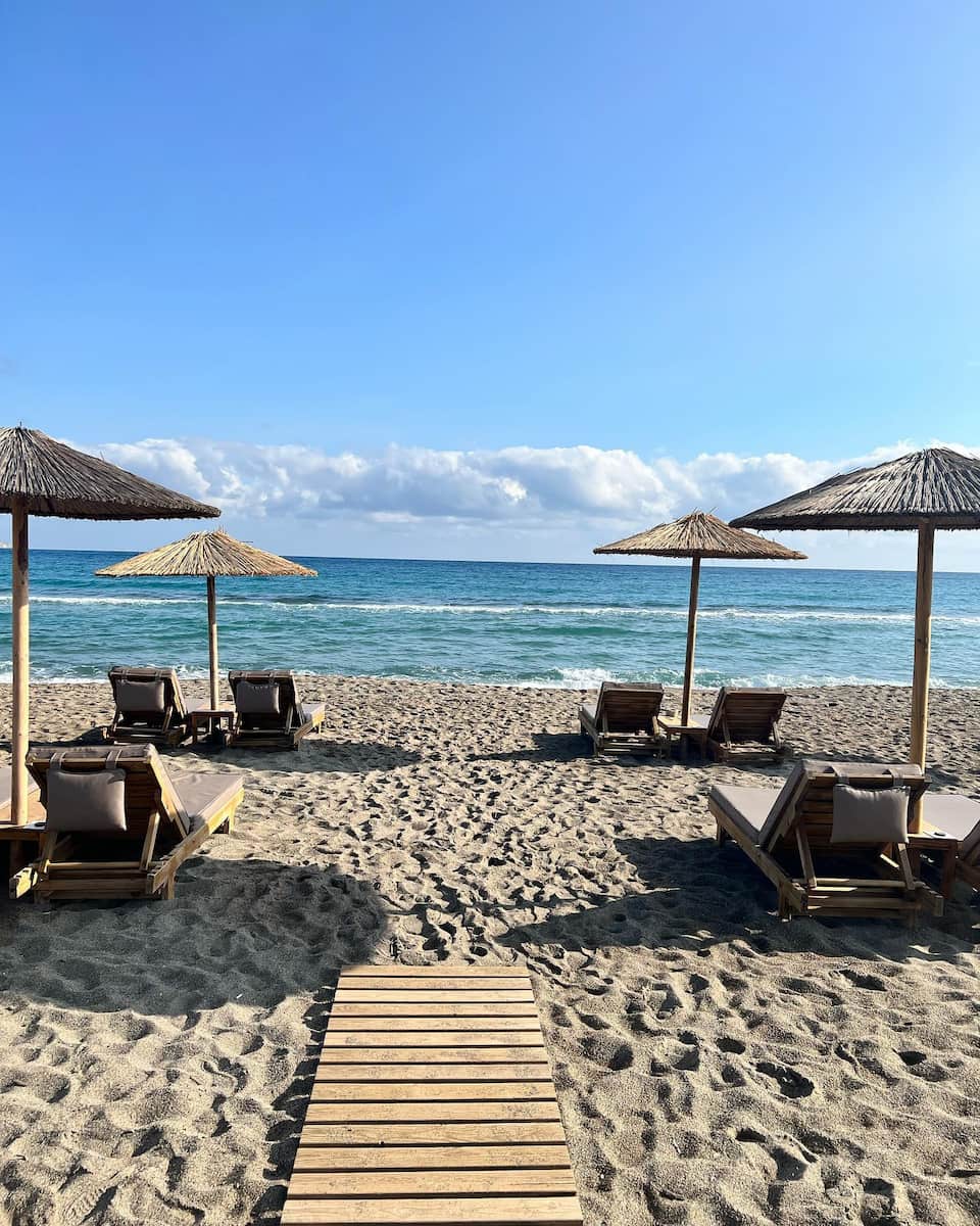 🍽️ Morsi sulla spiaggia: Quando la fame si fa sentire, c’è da leccarsi i baffi. La spiaggia è fiancheggiata da fantastiche taverne e ristoranti che servono una deliziosa cucina greca e cretese. Consiglio di provare Mourέlo Cretan Food & Drink Philosophy per un assaggio autentico dell’isola. Il loro polpo alla griglia è da urlo!