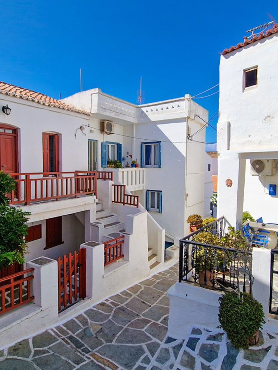 Il villaggio si trova a 5 km dal porto di Merichas e a 8 km da Chora, collegato da strade di montagna ben tenute. Vicoli lastricati di pietra si snodano tra case imbiancate a calce decorate con bouganville fucsia e profumati giardini di basilico. Potrete parcheggiare nelle aree designate fuori dal villaggio, per poi esplorarlo a piedi attraverso strade a gradini inaccessibili alle auto.