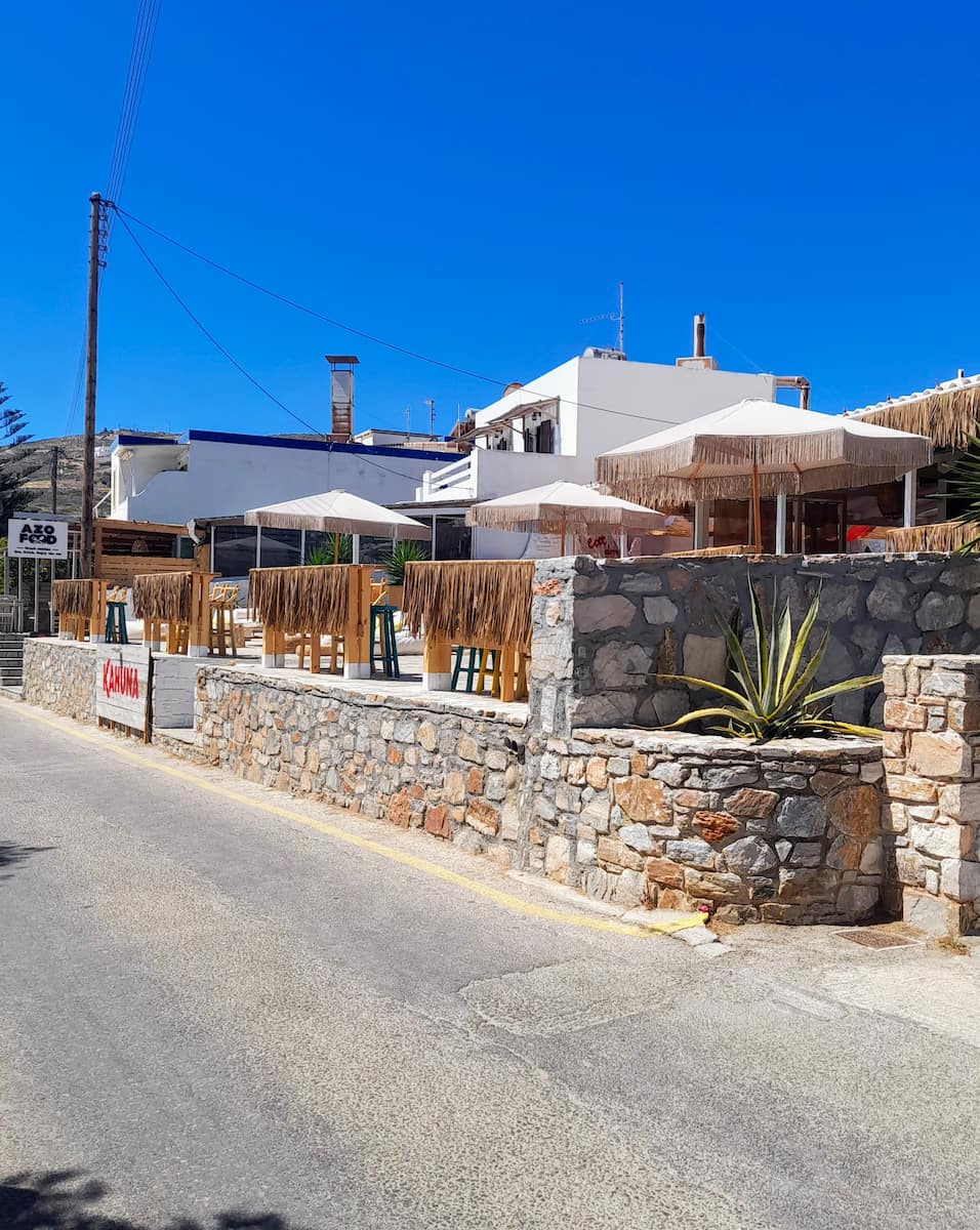 Cenare oltre i bar sulla spiaggia. La Taverna Azolimnos, proprio accanto alla spiaggia, serve ottimo pesce fresco (16-22 € a porzione) e ha un grazioso giardino. Il loro risotto ai frutti di mare (18 €) è famoso tra la gente del posto. Aperto dalle 19:00 a mezzanotte, si consiglia di prenotare nei fine settimana. Per uno spuntino veloce, provate Souvlaki Express vicino alla fermata dell’autobus (3-4 € a porzione).