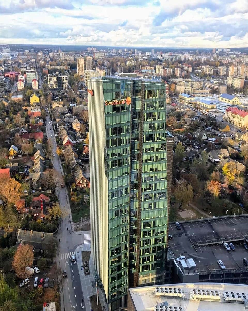 🏙️ Grattacielo centrale: Benvenuti a Šnipiškės, il nuovo centro di Vilnius che sta dando filo da torcere alla città vecchia! Mentre mi trovo sul ponte pedonale di Baltas Tiltas, mi colpisce il contrasto tra questa parte della città di Vilnius e le pittoresche strade di Užupis o il cuore della città vecchia.